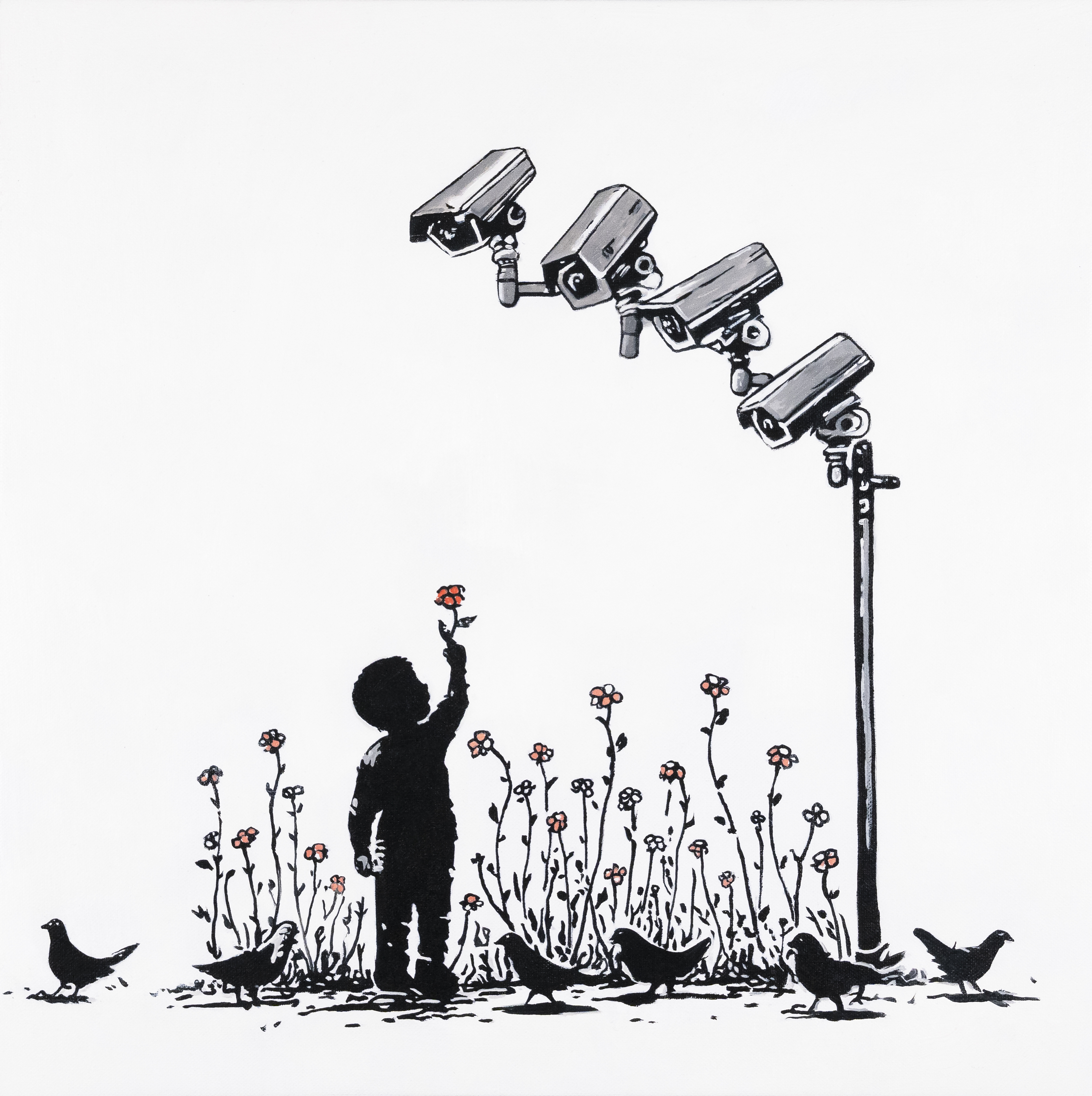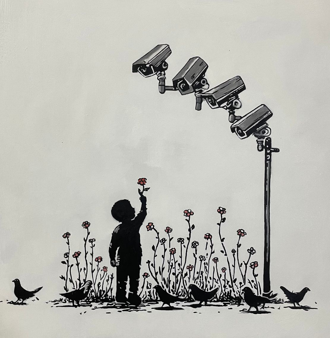 A child stands beneath a cluster of surveillance cameras, extending a single flower upward in a gesture of quiet offering. Around them, flowers bloom with camera lenses in place of petals, blurring the boundary between nature and observation. In A Flower for the Viewer, Mr Phantom addresses visibility, consent, and performance in a monitored world. The act is neither protest nor submission, but an acknowledgement of being watched. The flower becomes a question rather than a gift, offered not to another person, but to the unseen observer behind the lens. The work explores innocence in an age where presence is recorded, and humanity is shaped by constant spectatorship.