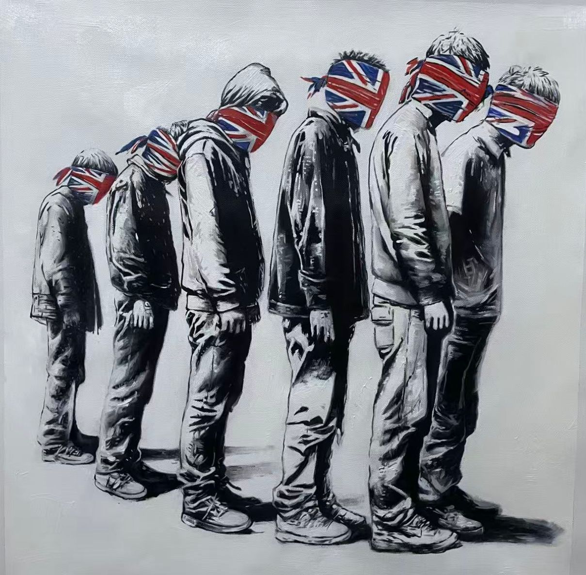 A line of figures stands in quiet formation, each face bound and obscured by the Union flag. Individual features are erased, replaced by a shared national symbol worn not as identity, but as a blindfold. In Blind Nationalism, Mr Phantom examines allegiance stripped of awareness, where belonging is prioritised over thought. The repetition of posture and concealment suggests comfort in conformity, while the downward tilt of each figure signals submission rather than pride. The work challenges the idea that nationalism inherently unites, instead presenting it as a force that can silence, restrict vision, and suppress individuality when adopted without reflection.