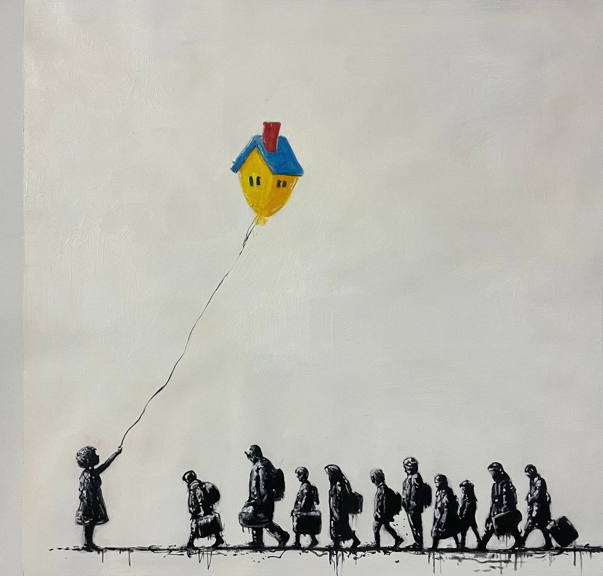 Goodbye Home captures the moment displacement becomes normalised. A line of figures moves forward in silence, burdened with belongings, while a single child remains behind, not resisting, but releasing. The house, rendered as a fragile balloon, floats upward tethered by a thin, wavering line. It is no longer a place of shelter, but a memory, light enough to drift away, heavy enough to hurt when lost. The figures march forward without looking back, suggesting forced migration, economic exile, war, or quiet social displacement. The child’s gesture is not one of protest, but of acceptance. Hope is present, but isolated. Home becomes symbolic rather than physical, something remembered rather than returned to. By removing context and geography, Mr Phantom universalises the experience. Goodbye Home is not about one country or crisis, but about a global condition: movement without belonging, progress without return.