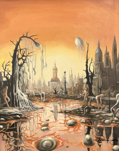 This piece weaves a cautionary tale through the stark juxtaposition of a desolate foreground against a once-thriving cityscape, reflecting on the fragility of civilization and the haunting beauty found within destruction.