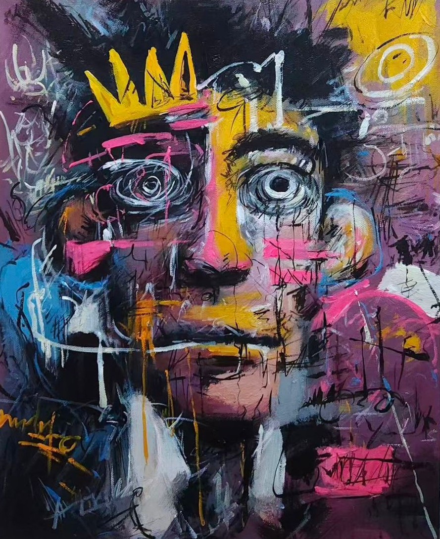Hollow Heir presents a stark meditation on inherited power stripped of certainty and selfhood. The crowned figure’s vacant, searching eyes and fractured features suggest an identity shaped by expectation rather than conviction. Simone’s aggressive layering, drips, and erratic line work create a sense of emotional erosion, reinforcing the notion of an heir burdened by legacy yet hollowed by doubt. The crown remains present, but its authority feels fragile and unresolved.