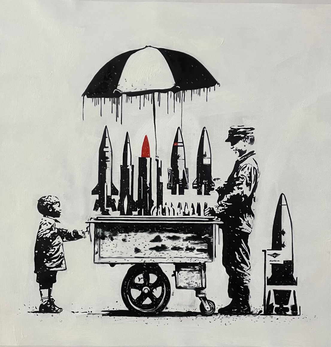 I Came for Ice Cream confronts the normalisation of war through the language of commerce and childhood innocence. A street vendor sells missiles from a cart traditionally associated with sweets, while a child stands waiting, not in fear, but expectation. The title is deliberately disarming. It reflects how conflict is repackaged, sanitised, and sold to the public: weapons become products, destruction becomes policy, and moral consequence is hidden behind procedure and distance. The umbrella above the cart functions as false protection, a fragile symbol of safety sheltering instruments of mass harm.