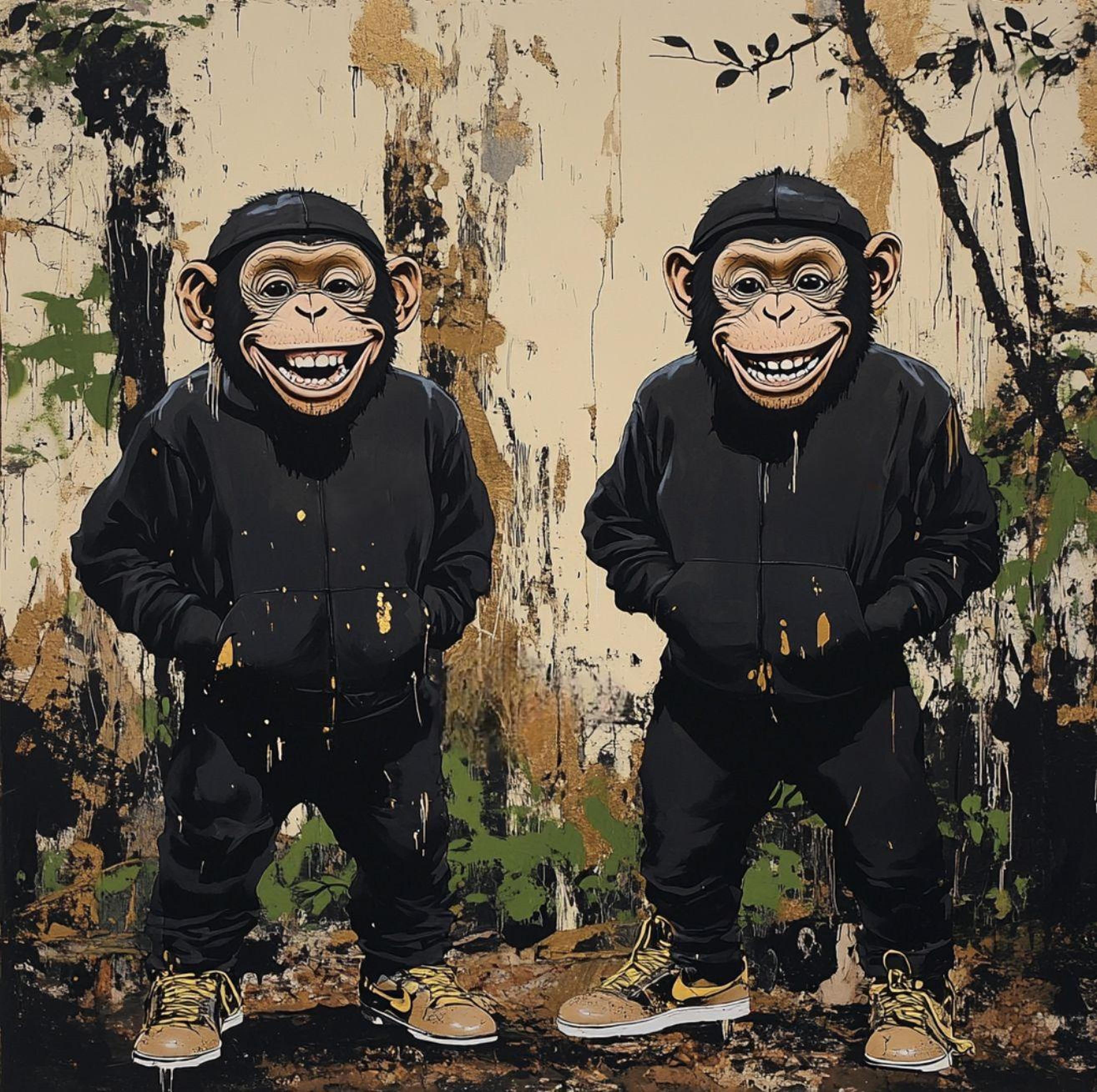 Mr. Phantom’s "Imposter Syndrome†is a compelling depiction of the anxiety and self-doubt that define the experience of feeling like a fraud. The artwork features two figures wearing monkey masks and streetwear, both standing in identical postures. The monkey masks convey a sense of disguise or 'playing a role,' indicating the hidden insecurities beneath confident exteriors. The casual, urban attire and weathered backdrop emphasise the everyday nature of these struggles, highlighting the tension between outward appearances and internal doubts, as well as the pervasive pressure to conform in modern society.