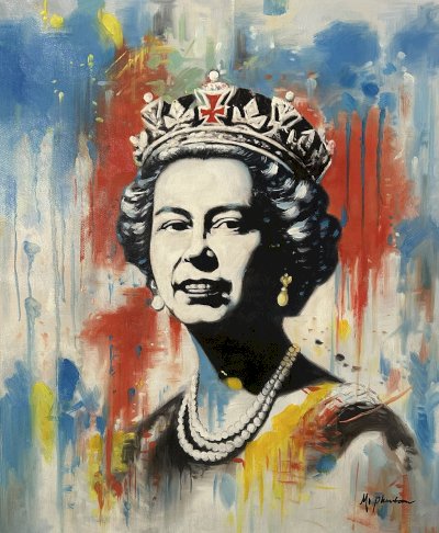"Mr. Phantom's 'Reign of Hearts' is a captivating collection of artworks that serves as a heartfelt tribute to the late Queen Elizabeth of England, who peacefully passed away last year. This collection encapsulates the enduring legacy and profound impact of her reign, encapsulating both the grandeur of her rule and the intimate essence of her persona.