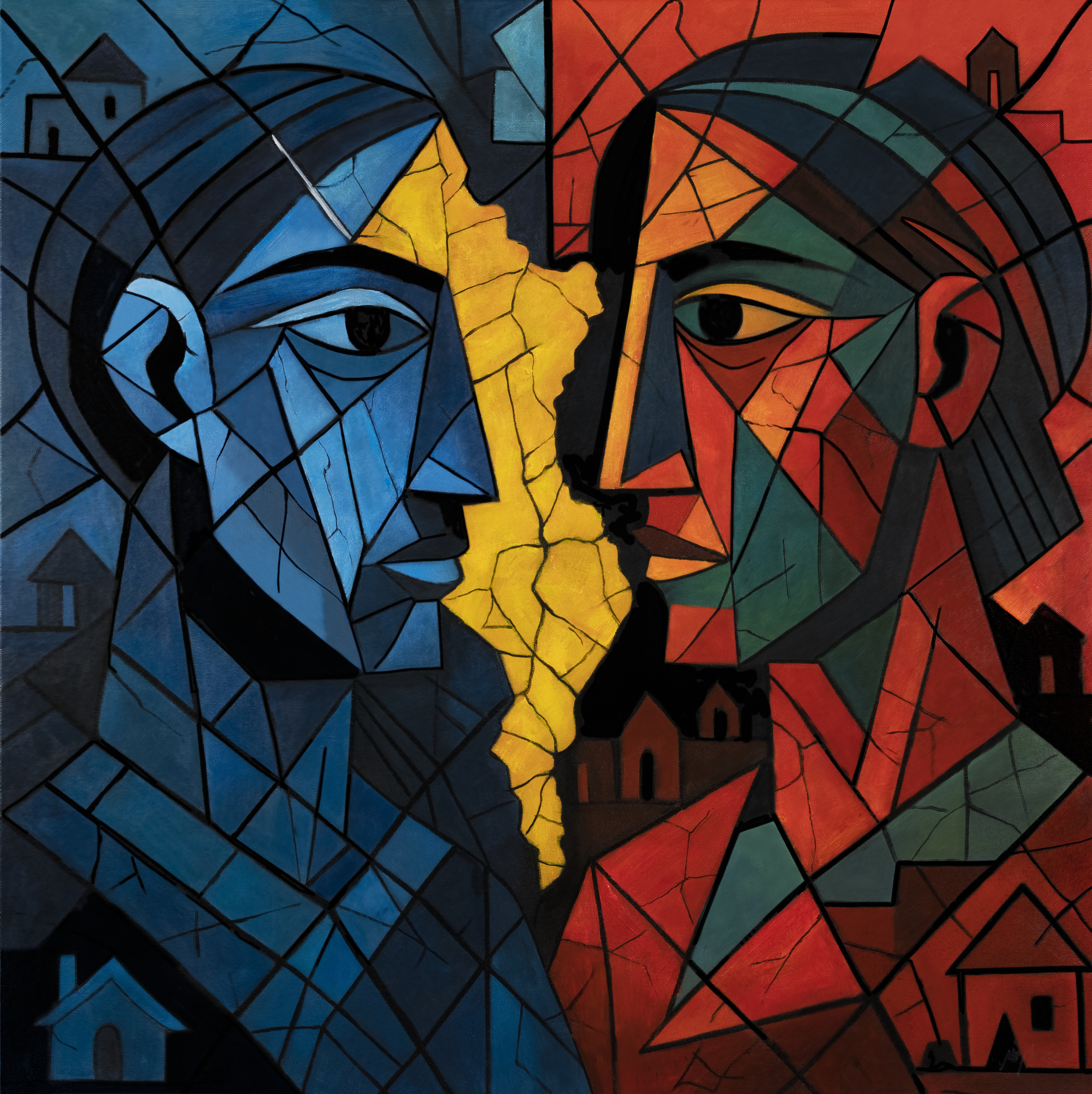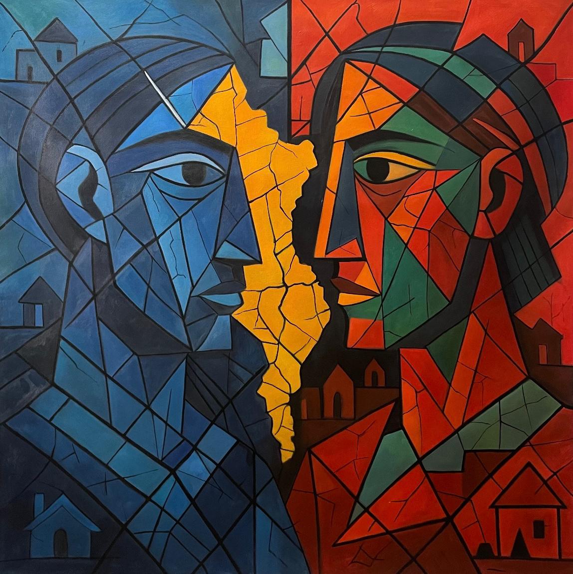 fractured faces confront one another across a narrow fault line, their features