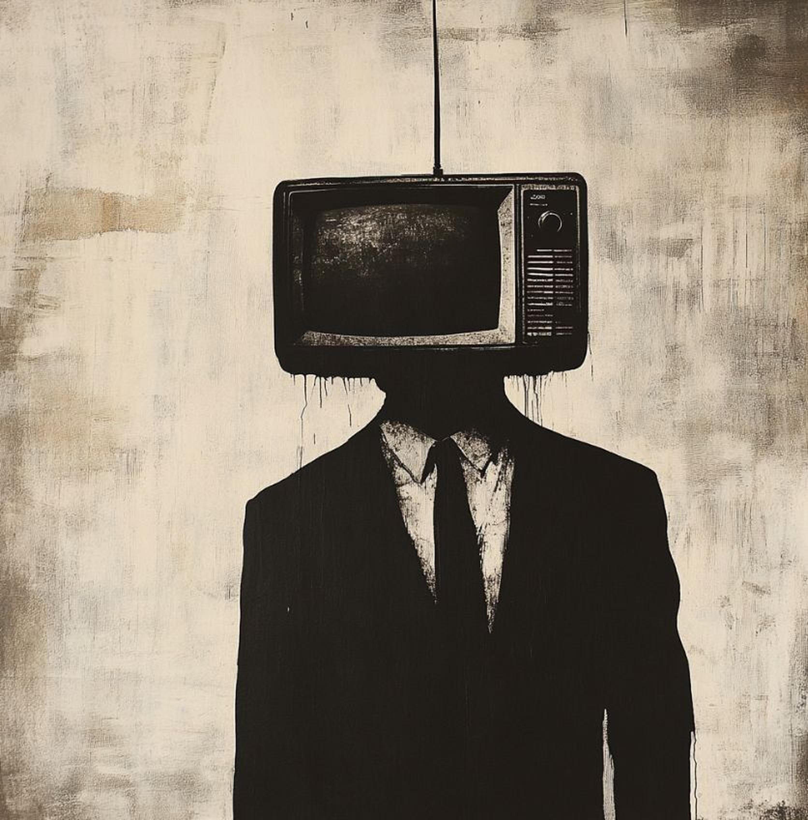 "Radio Silence" by Mr. Phantom is a stark commentary on the disconnect between human identity and the pervasive influence of media. The artwork features a figure in a suit with a television set for a head, symbolising the overwhelming control of media over individual thought and expression. The monochromatic palette and the figure’s faceless appearance highlight a sense of emptiness and the loss of personal identity in a world dominated by broadcasted information. The concept of "radio silence," typically associated with an absence of communication, here ironically underscores how constant exposure to media can lead to a void in meaningful communication and self-awareness. The piece reflects on the dehumanising effects of modern media saturation, where individuals risk becoming mere vessels for external content rather than independent thinkers.
