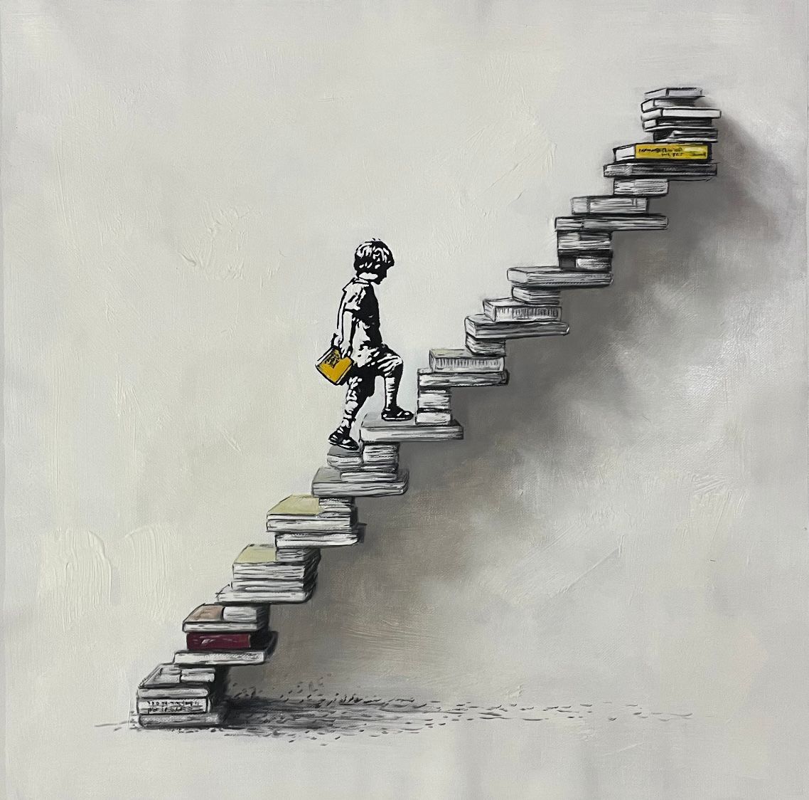 A child ascends a staircase built entirely from books, each step uneven, fragile, and stacked by those who came before. Knowledge becomes both the path and the burden, something that must be climbed carefully, one page at a time. The ladder rises, but it is not fixed, not guaranteed, and not offered equally to everyone. Some steps are stable, others worn thin, yet the ascent continues regardless. The Lord’s Ladder reflects on ambition, learning, and the quiet pressure placed on the next generation to climb higher than the last, even when the foundation beneath them feels uncertain.