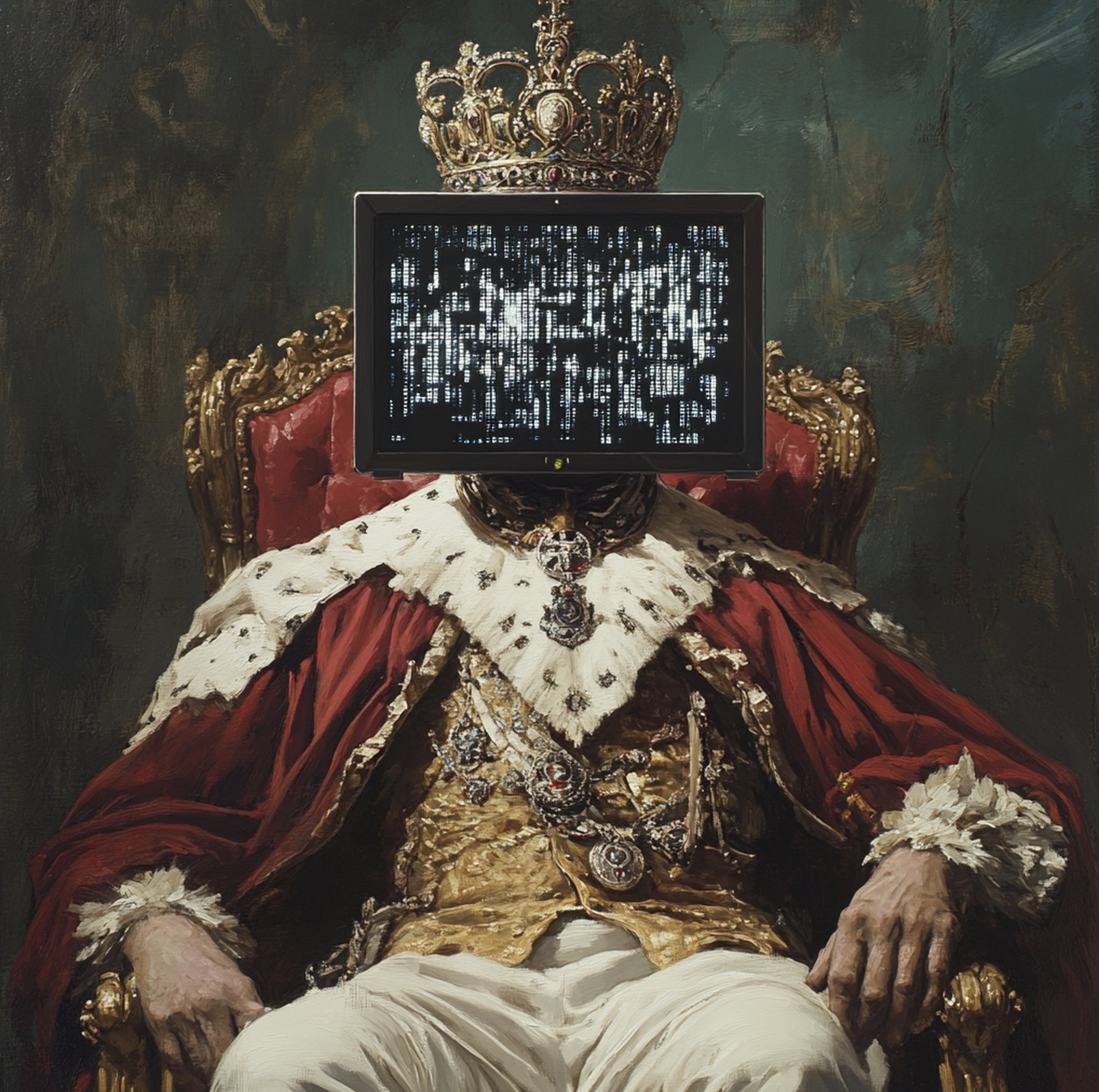 Mr. Phantom explores the idea of reality as a carefully constructed simulation, using the symbolism of British royalty to make a broader statement. The figure in the painting, dressed in rich, traditional royal attire, sits on an elaborate throne. However, instead of a face, there is a screen filled with fragmented code. This screen represents the hidden digital framework that controls and manipulates our perceived reality. By merging the opulence of monarchy with the cold, impersonal nature of a computer screen, Mr. Phantom invites viewers to question the authenticity of the world around them, suggesting that what we see as power and tradition may merely be an illusion within the matrix.