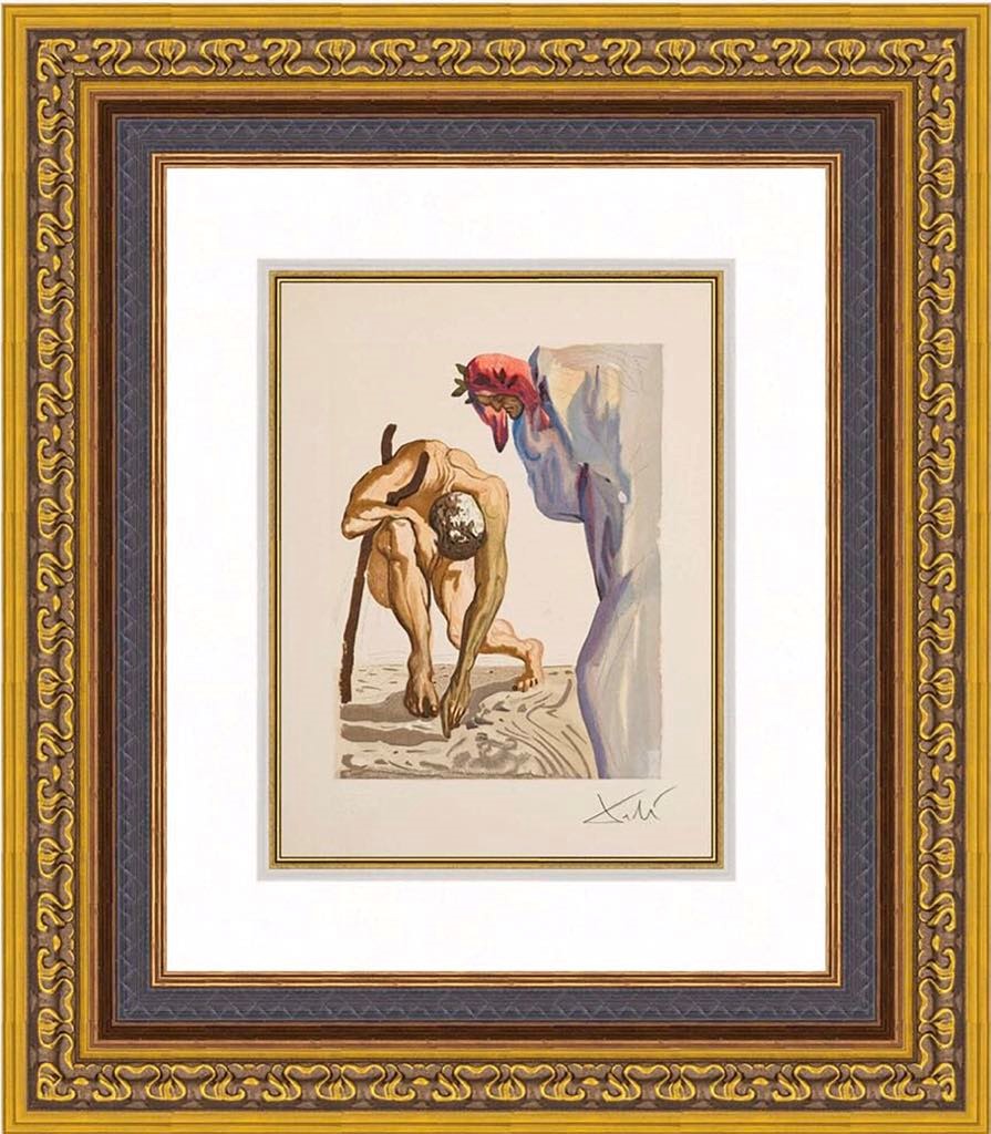 This wood engraving by Salvador Dalí is part of his monumental illustrated edition of Dante’s Divine Comedy, created between 1951 and 1964. The complete suite includes 100 engravings, one for each canto, based on Dalí’s original watercolours and engraved using color blocks by Raymond Jacquet under Dalí’s supervision.