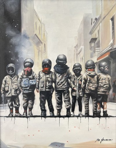 In each poignant piece, 'Shadows of War' presents intimate glimpses into the daily struggles, fears, and hopes of those affected by the chaos of war. Mr. Phantom's art skillfully unveils the courage and resilience of these individuals, emphasizing the value of every life and the innate human desire for peace and security.