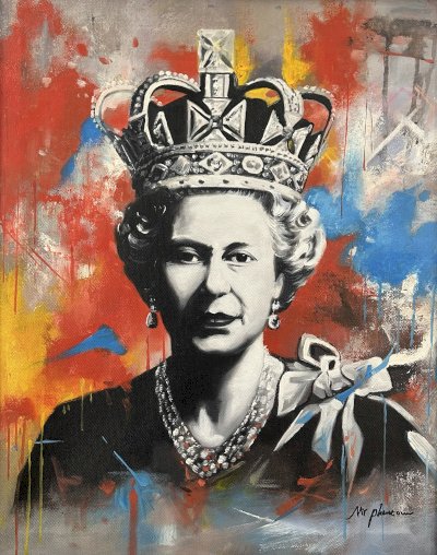 From the "Reign of Hearts" collection, this artwork juxtaposes the stoic, timeless image of a queen against a backdrop that dissolves into chaos. The vibrant red surrounding her symbolizes a reign marked by the passion and strife inherent in power. This piece might reflect on the enduring nature of leadership and its influence on the hearts of a nation. The dripping paint serves as a metaphor for the turbulent emotions a ruler must navigate, all while upholding the composure and dignity that the crown demands.
